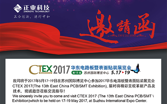 一年一度的華東電路板暨表面貼裝展(CTEX 2017)就要來啦!正業(yè)科技將隆重參加此展會(huì),展示公司最新的技術(shù)成果,至誠邀請(qǐng)新老客戶參加蒞臨我司展位觀摩指導(dǎo)。